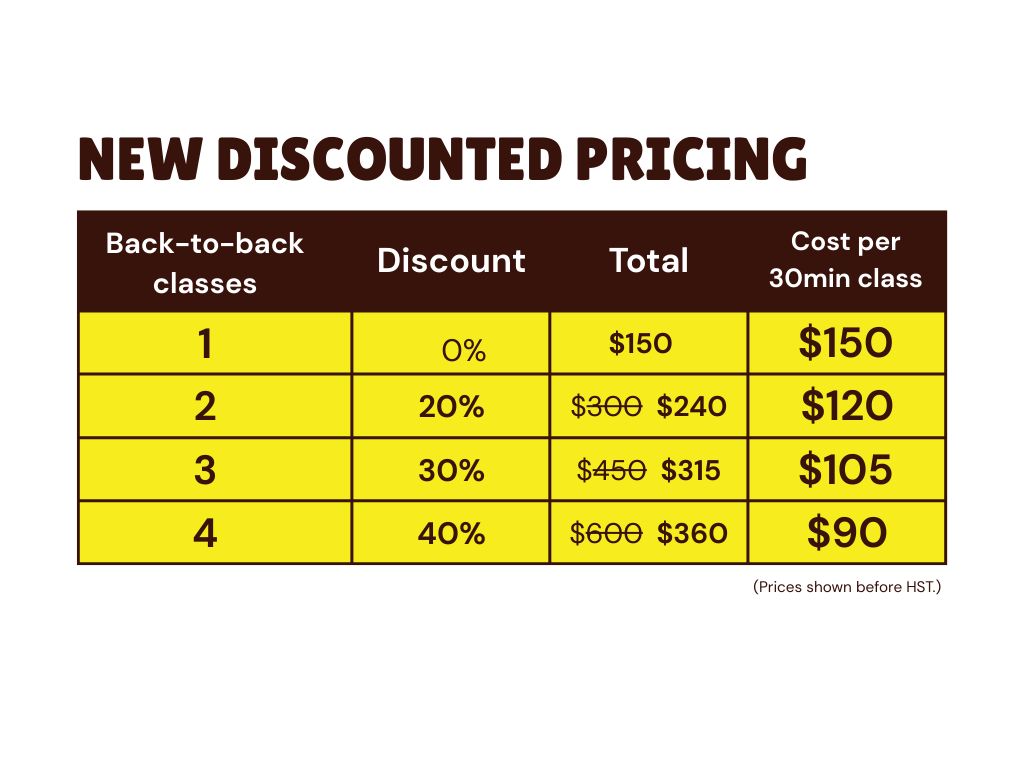 Receive discounted pricing when booking multiple classes in a series of four or more weekly, bi-weekly, or monthly sessions.